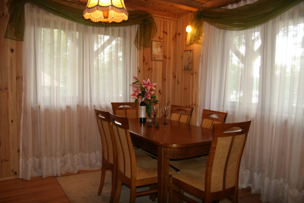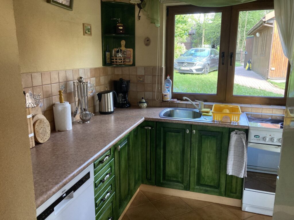 Zaraz obok salonu znajduje się kuchnia wraz z jadalnią (stół dla sześciu osób) – jest w pełni wyposażona we wszystko, co może nam się przydać na urlopie. Poza takimi podstawowymi elementami jak garnki, patelnie, talerze, sztućce czy szklanki, do dyspozycji Gości jest zmywarka (tabletki myjące są na miejscu), kuchenka elektryczna z piekarnikiem, lodówka z zamrażalnikiem, kuchenka mikrofalowa, ekspres przelewowy, toster, blender czy zestaw do raclette.