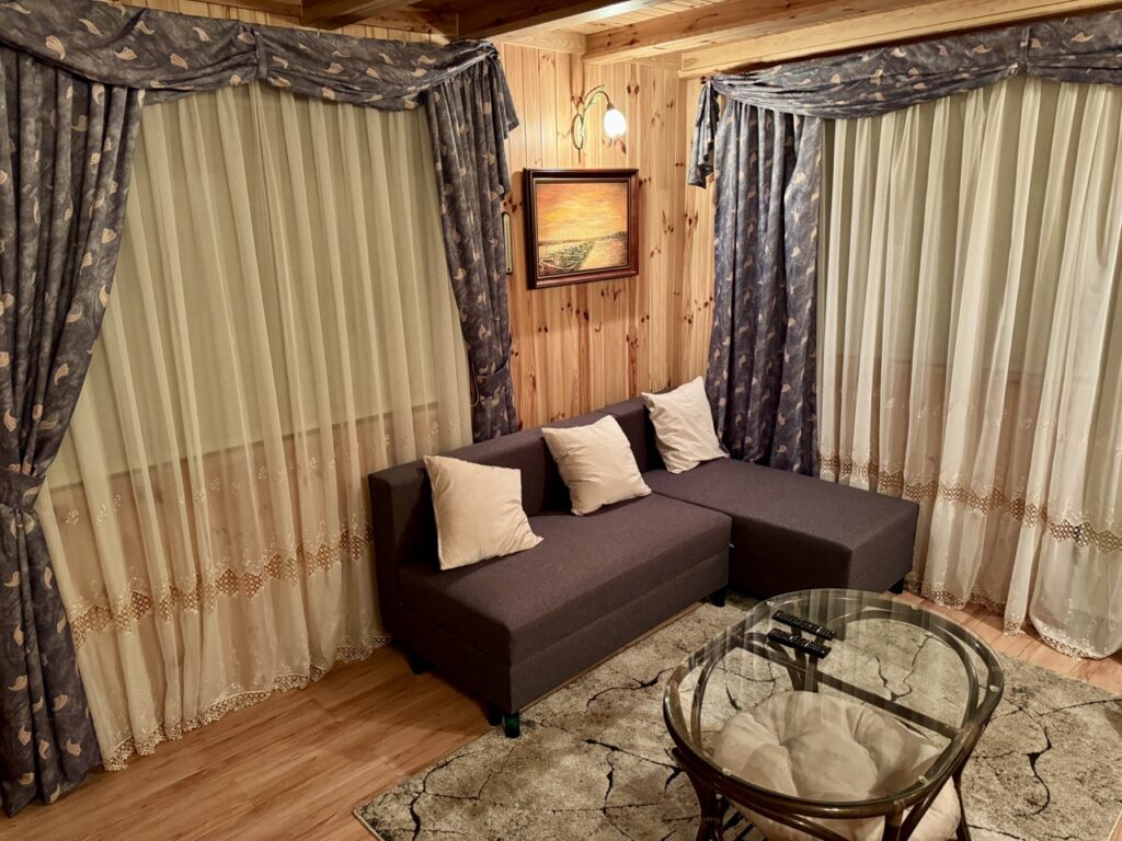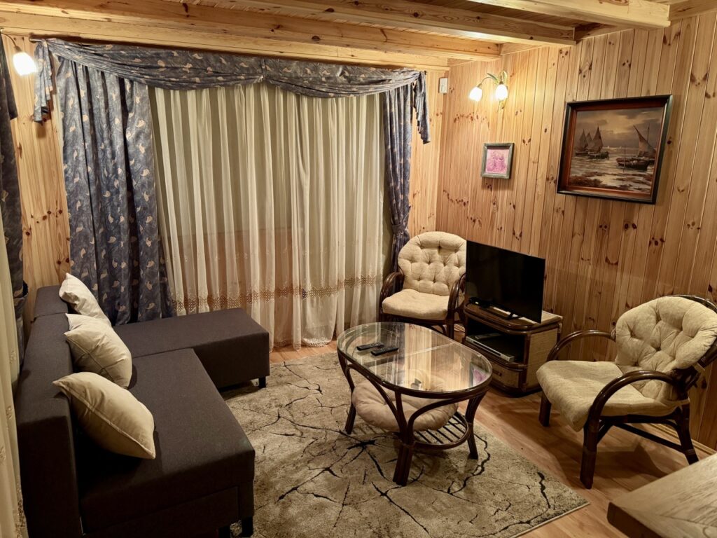 Na parterze znajduje się salon z kominkiem wraz z telewizorem, DVD, CD, grami planszowymi, książkami oraz mapami okolicznych terenów. Z salonu jest wyjście na taras wyposażony w stolik i dwa krzesła, gdzie popijając kawkę można rozkoszować się widokiem na jezioro. W salonie istnieje możliwość skorzystania z rozkładanego narożnika.